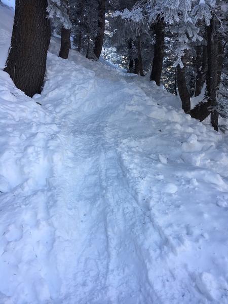 Photos below: 1. looking downhill from the trail 2. where the avalanche crossed the standard trail, now used by snowshoers.
