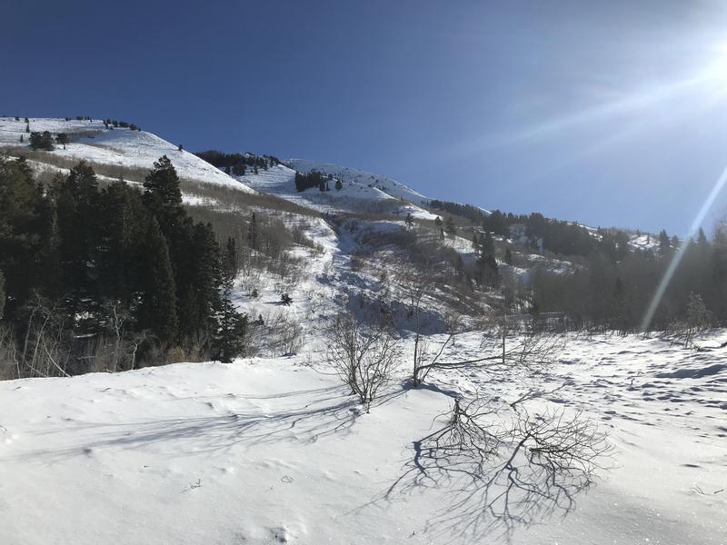 Natural avalanche that I'm guessing slid during the major storm cycle earlier this week. We were unable to see where the avalanche started but it ran across and beyond the road, completely filled the gully with debris, and destroyed and bent over trees in its path.