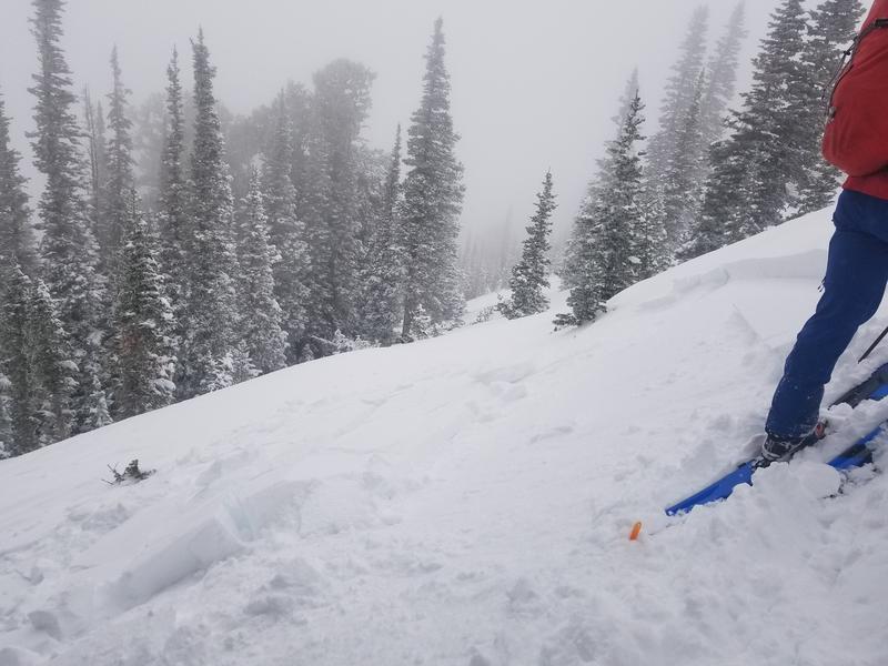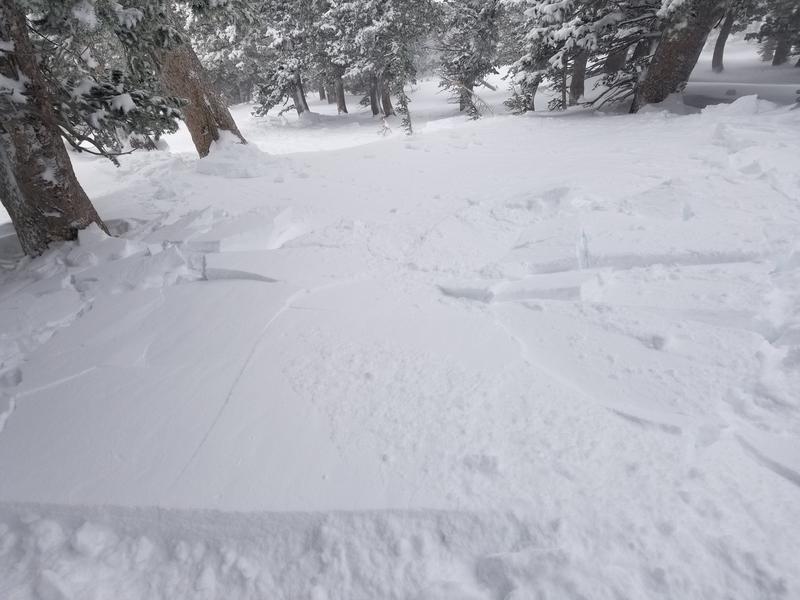 Released a handful of small wind pockets while descending the Banana Chute. Slides released on the new/old snow interface on wind affected pockets of the new snow, typically around 6 to 8" deep, give or take. Slabs were generally soft (<=4F), though there were zones that seemed a bit harder, which we generally avoided when possible. First photo is of one of the bigger releases. We also set off an isolated cornice/hard wind slab while ascending the ridge to the top of Allen Peak (second photo).