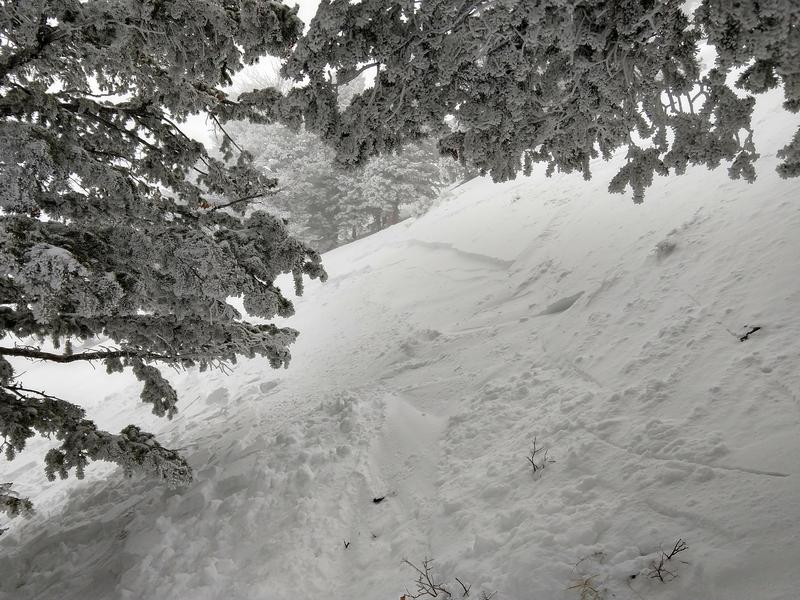 While looking for leftover powder across Snowbasin today, we were excited to hear that No Name was cleared for entry in the afternoon. Around 2:00, the three of us took the tram to Allen Peak. We immediately noted the strong W winds loading snow onto E slopes. All three of us carried beacons and rescue equipment. Deciding to keep it safe, we worked one at a time along the traverse and down into the trees just above Easter Bowl. At around 8700', I made a turn exactly where Jon and Joel had skied through and broke the small wind slab free shown in the photo. Fortunately, the slab did not slide far, and we were all unharmed. The terrain was roughly 30-35 degrees. We continued cautiously down the lowest angle terrain possible and notified a ski patroller of the incident.