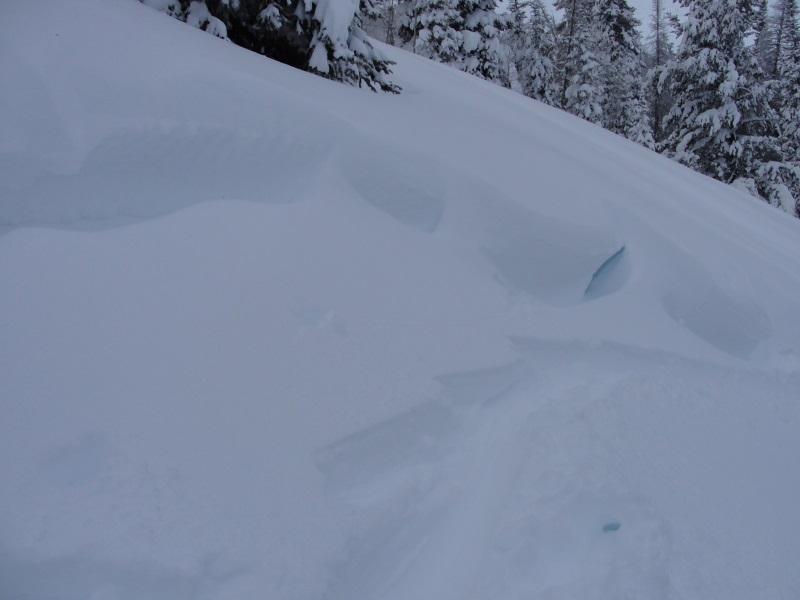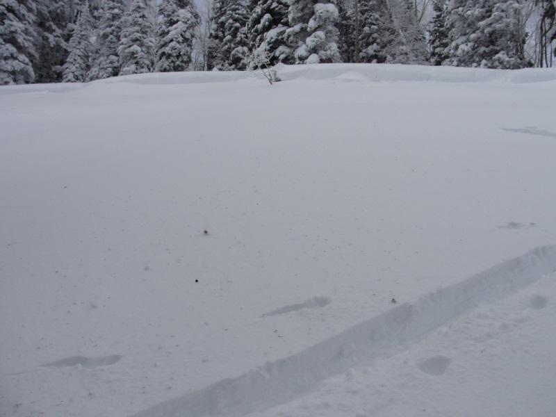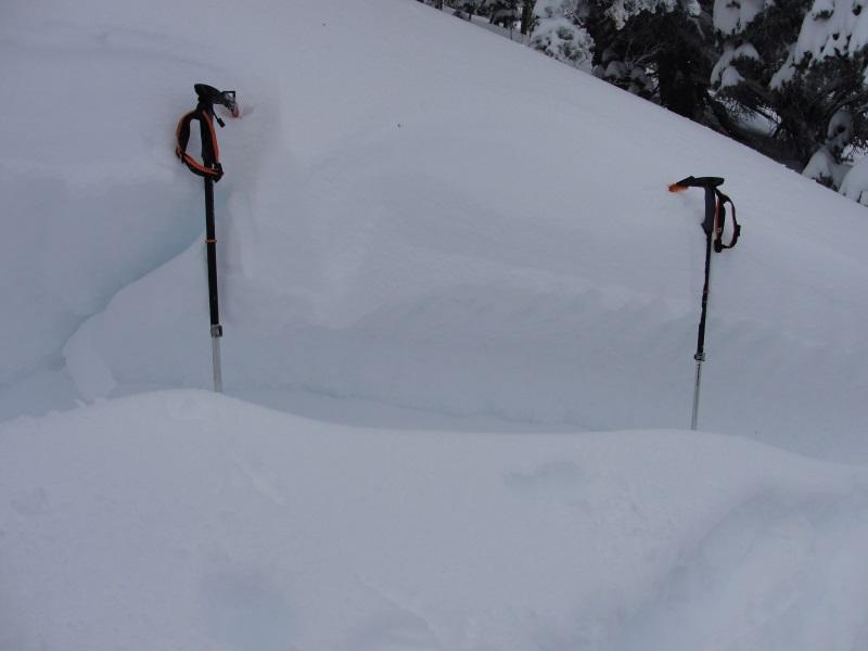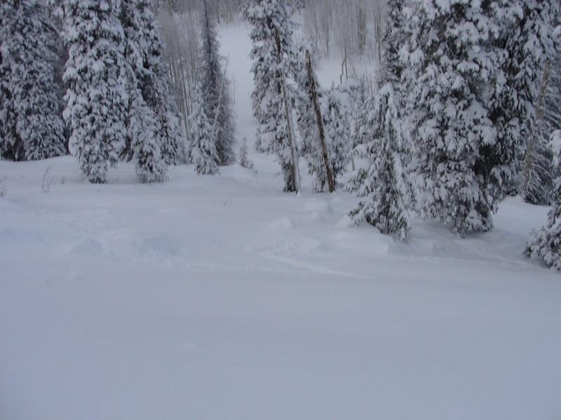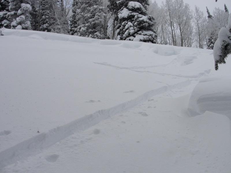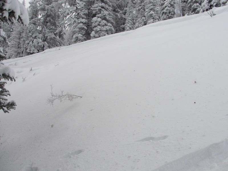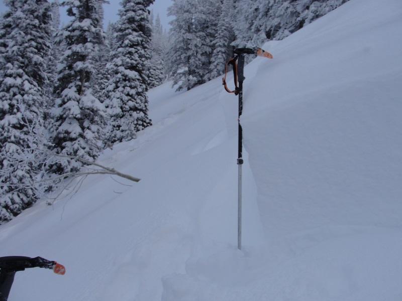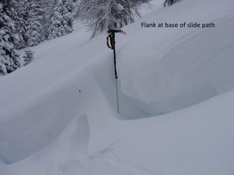 I got out early this morning to ski some quick low altitude laps. The new snow is right side up and where not wind effected is riding and skiing great. The problem, however; is that there is wide-spread wind loading even in treed terrain that normally is de-void of wind effect. I was skiing in this area on Friday purposely staying away from this small steep section skiing 30 degree treed terrain nearby. In fact when I approached this small section on Friday I actually walked back downhill and all the way around because I felt the low altitude terrain would be much more dangerous as it has more facets. Fast forward 3 days and had I not respected my intuition and walked down and around my skin track would have gone right through the lower angle lookers left flank. If you look closely the lookers left flank is thin meaning this is a great place to trigger a slide. This is valuable information which is going to be archived in my brain. There is a solid foot of snow on top of the weak layer so I suspect the slide occurred during the beginning of the storm then loaded back up during our post frontal wind event. This is another sign that on Friday I was approaching a slope that was teetering on collapsing. Oh one more comment, take a look at the last flank pic. That's at the base of the slide path and after subtracting out the new snow on top the flank is still 2 feet thick. The first hit of this storm cycle laid down a very cohesive slab connecting terrain features such as downed trees and rollovers allowing for larger avalanches. This soft slab failed on the melt-freeze layer that formed January 8th-10th when the temperature remained above freezing for 2 days and reached mid-forties on the 9th at the beginning of our last high pressure cycle.