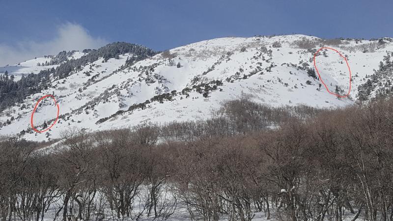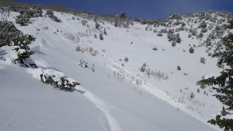 On my tour today I did not have any other signs of weakness, but while descending back to the North Ogden Divide Parking I took a few turns and kicked loose a relatively small slide.