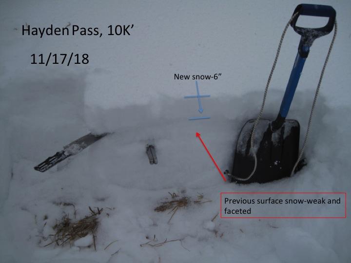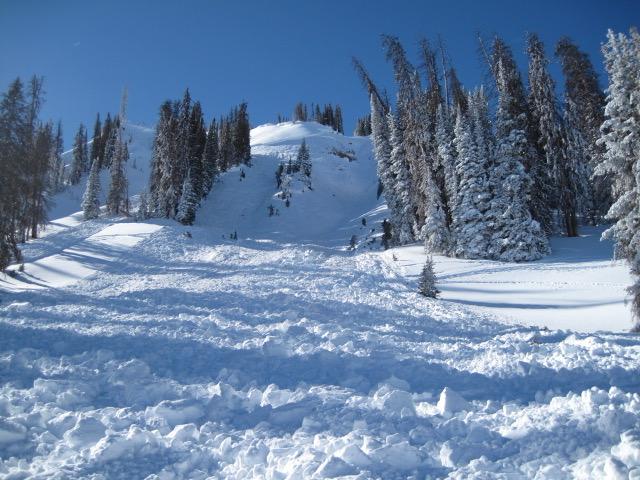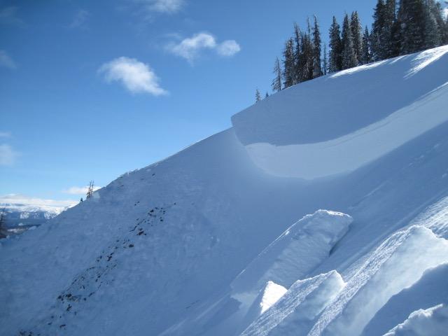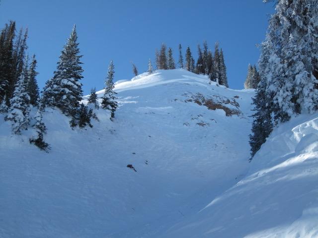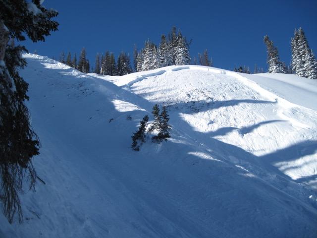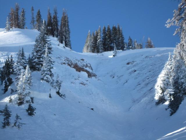 The lookers right flank of the slide was around 3' deep, while up near the ridge line the crown was closer to 5-6' deep. This hard slab avalanche failed on sugary faceted snow that formed earlier in the month. This area as seen from some of the photos is a steep, cold, shady northeast aspect with weak sugary faceted snow and a dense hard slab sitting on top. All it takes is a person to find the shallow weak spot, collapse the slope releasing a scary avalanche. Glad to hear no one was caught in this one.