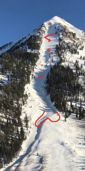 Photo: The top zigzag represents the slope cutting effort the group made. The circle is where the person was caught in the wind slab and stopped shortly after. The horshoe line is where the deeper pocket was triggered and the lines at the bottom is where the debris finally came to a stop.