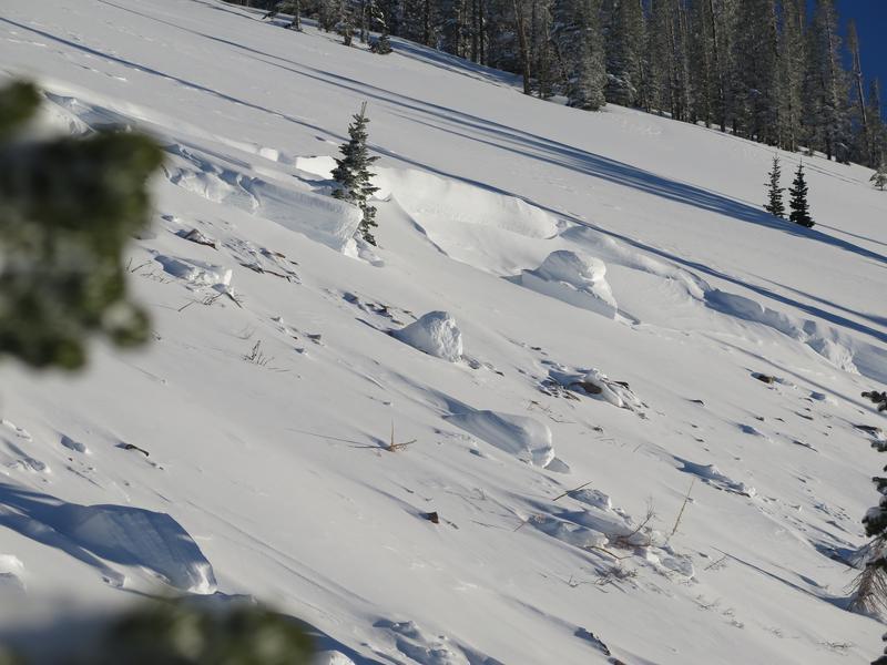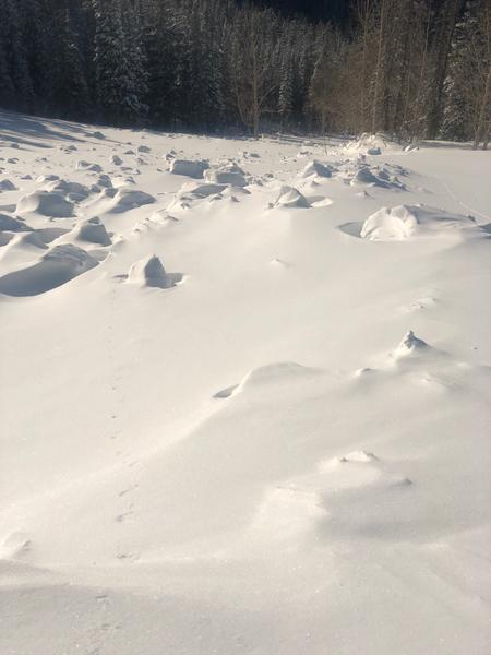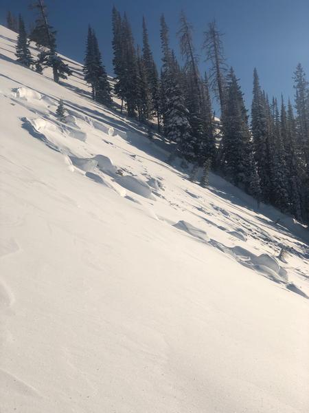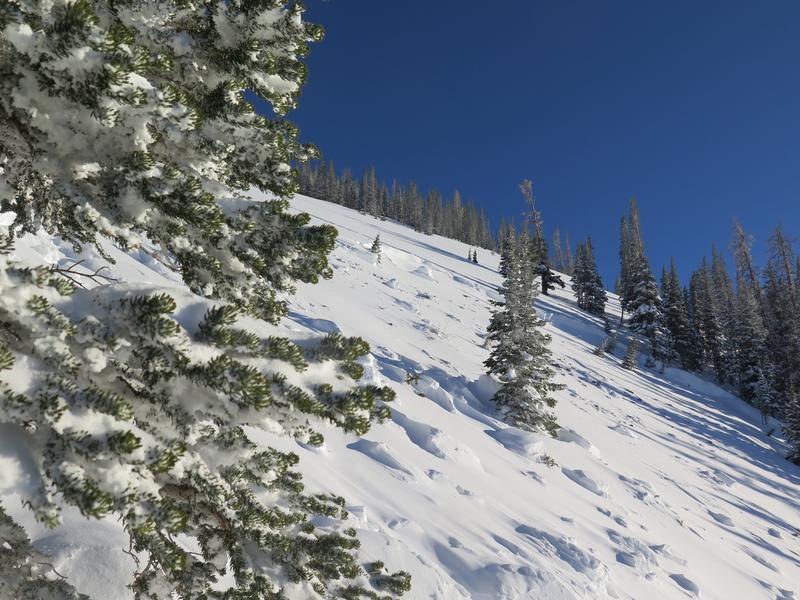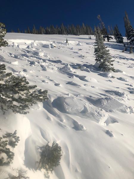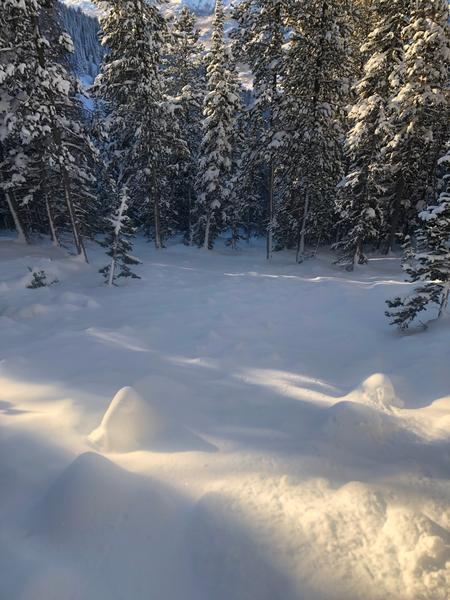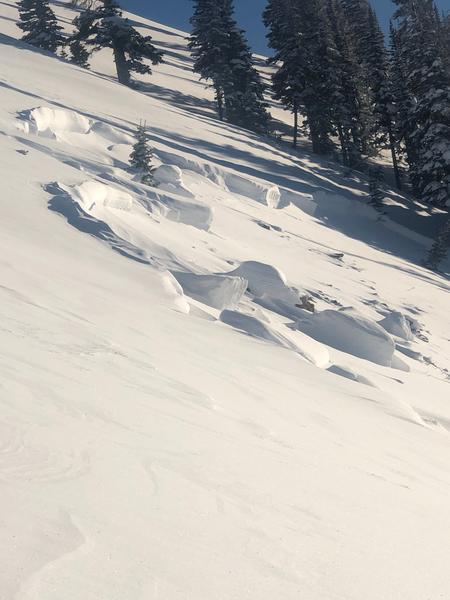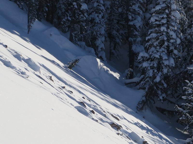 We came across this slide at the end of the day. I'm guessing it happened sometime on Wednesday the 6th or possibly Tuesday the 5th. There was a few inches of snow on the bed surface. Since it was the end of the day and there was still a decent amount of hang fire above the slide I didn't venture onto the bed surface at the crown. It looked to be between two and three feet deep at the crown but it appeared to have stepped down close to the ground. I'd guess the slide either failed at the new snow/old snow interface or, more likely, on the persistent weak layer that formed at the beginning of January, and then stepped down to older snow. Parts of the flanks were 5 feet deep and snow was piled up 6 to 8 feet deep on th uphill side of the trees. The most impressive aspect was the distance the slide ran. I'd say it ran close to 1000 feet or possibly more but the bottom half of the path is relatively forested and it kept making it's way through the trees. D3R3?