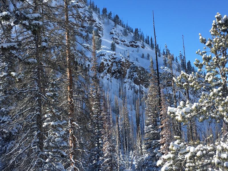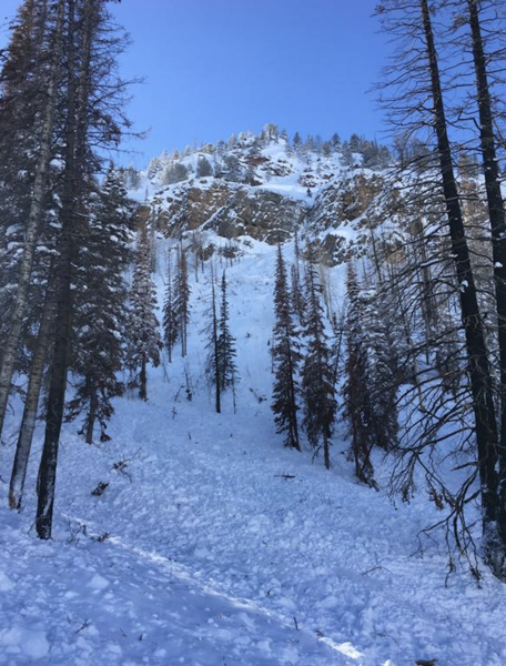 Today was one of those days where we realized how lucky we got. While we were very aware of what was overhead, we didn't think we were in danger. This ripped out about 1/2 hr-45min after we skinned by it. This slide covered our skin track. It would not have buried us, but it would have for sure knocked us over or roughed us up in passing. Sobering.