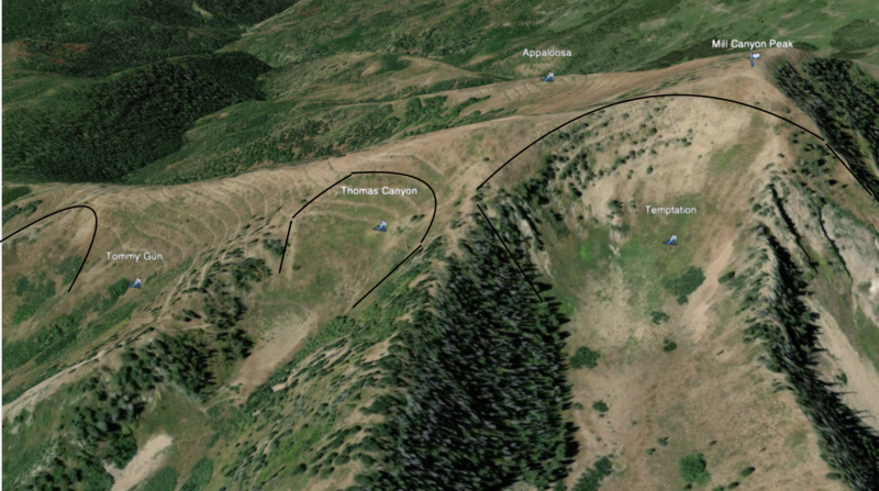 The two other slides, most of Tom's Canyon & the left lower side of Tommy Gun slide. There was a minor earthquake early that morning, just saying. Can not say for sure that was the cause of all three releasing but it would be interesting to check out the debris pile in the bottom of the Temptation basin. I have attached images of the three slides, one of all three and a topo with approx. placement. It was eye opening.