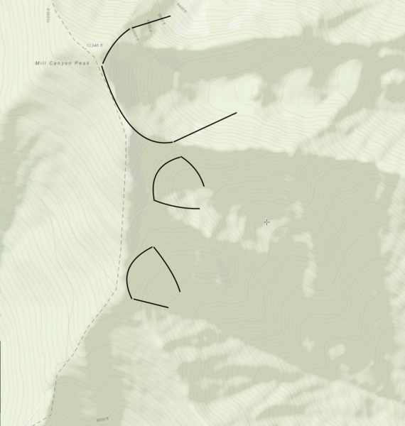 Working at Soldier Hollow Biathlon. On the morning of the 15th noticed the three slides on the East, South East face of Mill Canyon Peak. Temptation, Tom's Canyon and Left side of Tommy Gun. The whole East face basin off the top of the Peak had released with the crown face, Approx. 6'-4' x 1/4 mile long? Plus raced around the north corner of the basin. It is identified as Temptation in the Wastach Back Country map.