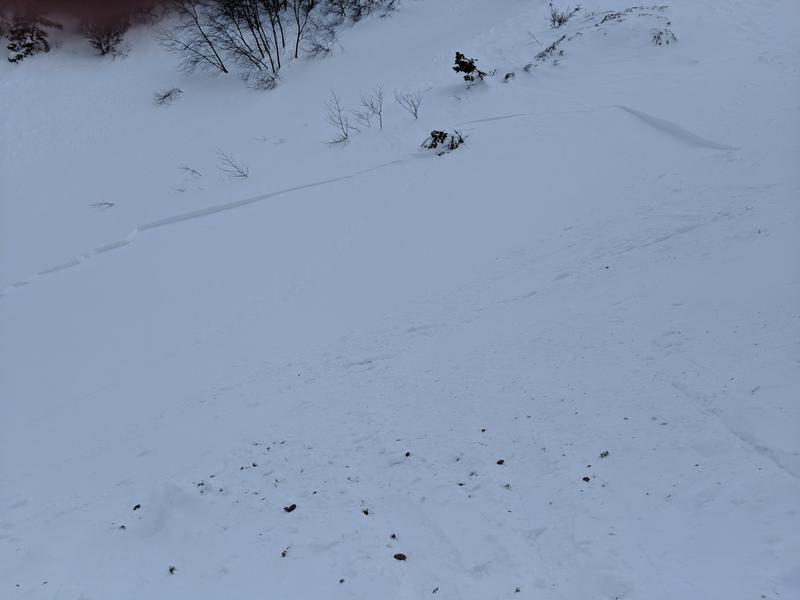 Remotely triggered wind slab, slid about 100', crown was 6" or so at it's deepest. No one was caught. The upper 1300' of the chute was wind scoured but otherwise stable. Some cornices at the top, no other red flags noted.