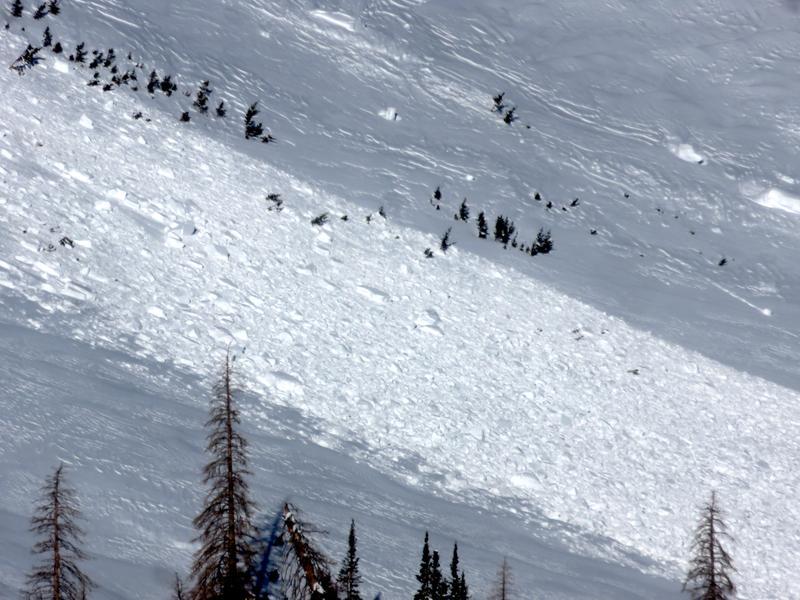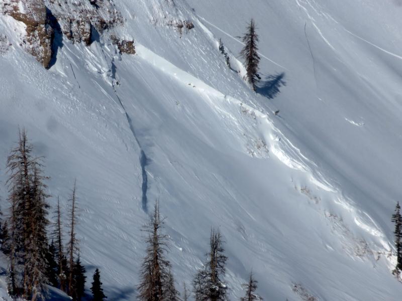 When zoomed in you can clearly see the missing piece of cornice and the depth of the slab. This slide is another repeater which last ran late January. It looks to have once again failed on the upper most layer of depth hoar that was not cleaned out during previous slides. This continues to be a theme with many of the large events in the Uintas this winter. Each event is failing at a deeply buried, relatively strong layer of facets but not eliminating them. Much weak snow remains in the bed surface and the combination of advanced facets and thin snowpack continues to provide the recipe for big delayed action avalanches. It has been over one week since the last significant new load to the pack and we are still seeing big slides initiated by big triggers.