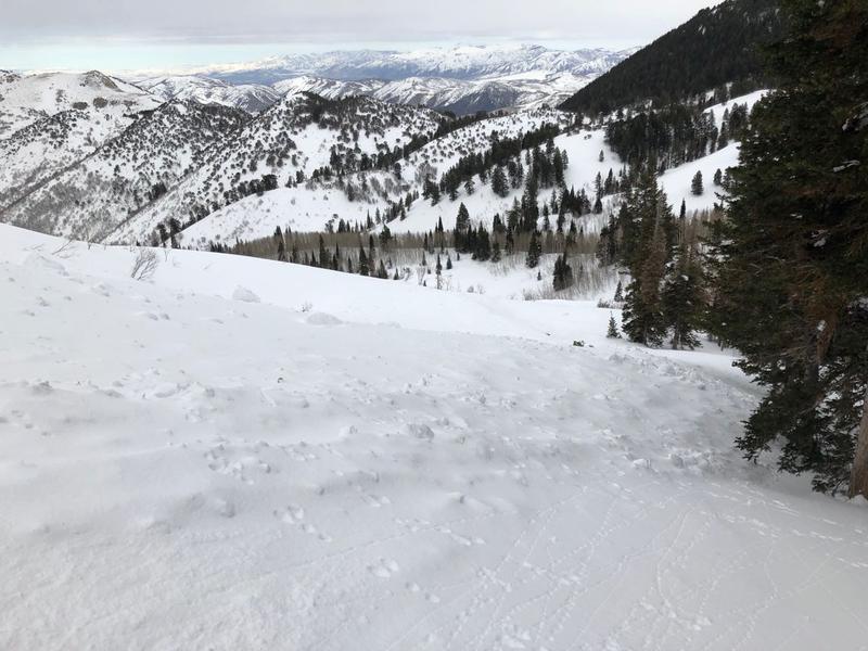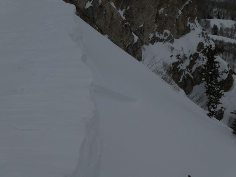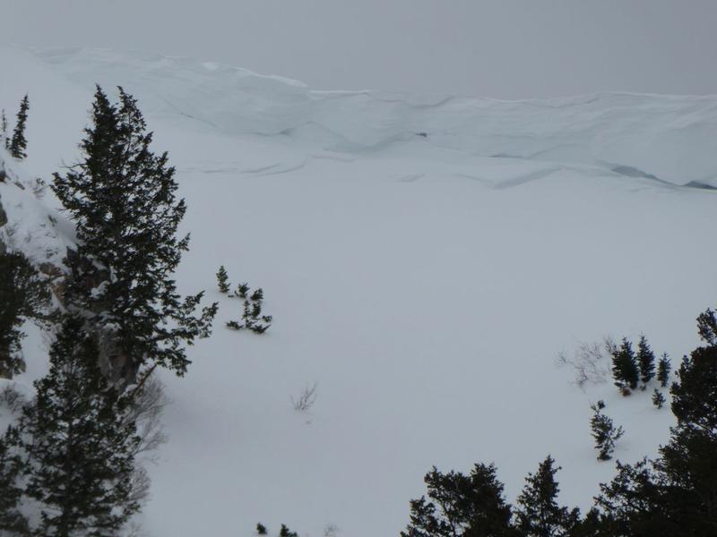 This is just north of the far north end of the North Fork drainage above Perry Lake. My guess is this avalanche occurred sometime last Saturday afternoon or evening, but maybe later. I was skiing in the Cutler Ridge area then and the winds were very strong from the SW and snowing lightly. Since then it has been windy but not as intense I don't think. Really hard to say on that though. I was in this area last Fri. and did not see any signs of recent avalanches then. This was clearly a hard slab by the size of the snow chunks way down the slope. It almost ran full track but not quite. 1000' of 1200'. The cornice on the ridge is massive! There is some new snow with some more wind so it's hard to tell especially from a distance but it looks to be at least 2' deep and about 100' wide. I snuck in the far skiers right side of the path and skied to the bottom. Overcast clouds came in when I got ther and the lighting wasn't that good but I got some zoomed in photos from the starting zone on my skin out and some from the top.