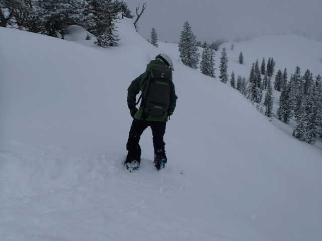 We had several 50 foot wide by 6-8 inches deep slabs fail at the new/old snow interface. The slab avalanches failed on north facing steeper slopes around 35 degrees and all above 9000 feet elevation (see the .gif and pictures). The slab avalanches slowed down and stopped as soon as the slope angle decreased to around 30 degrees.