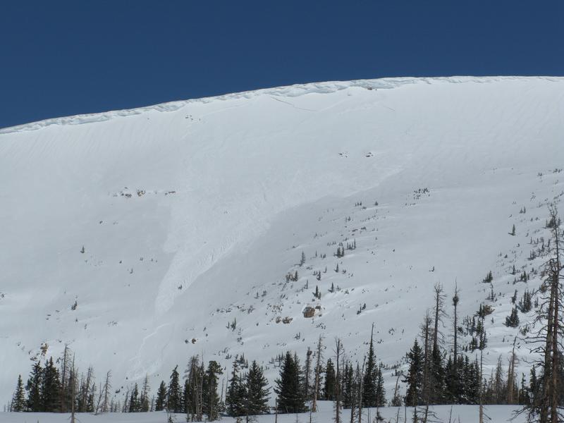 Right out of the gates, the sun softened a piece of cornice which dribbled onto the steep slope below, triggering a fresh wind slab this morning.