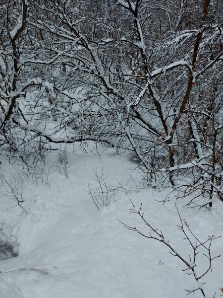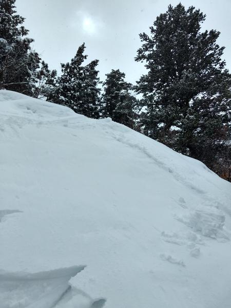 Dry snow avys still possible on weak layers from overloading. This small soft slab was triggered by my ski cut into the creek bottom. Ran on sluck rain crust at low elevation. The new snow was heavy and had bonded poorly. Much better stability higher at 7000 (top of summit chair) and wind drifting would be of more concern. Lots of groups dropping into the backcountry. At least go one at a time and find a safe place to stop!!