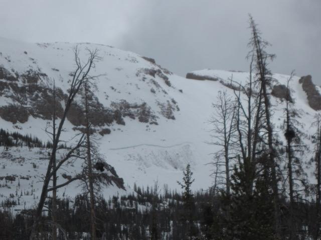 Spotted this piece of snow that avalanched recently as I was leaving the Lofty area. Just guessing on most of the information as I was a good distance away. A nice wet slab that released to the ground under a rock band.