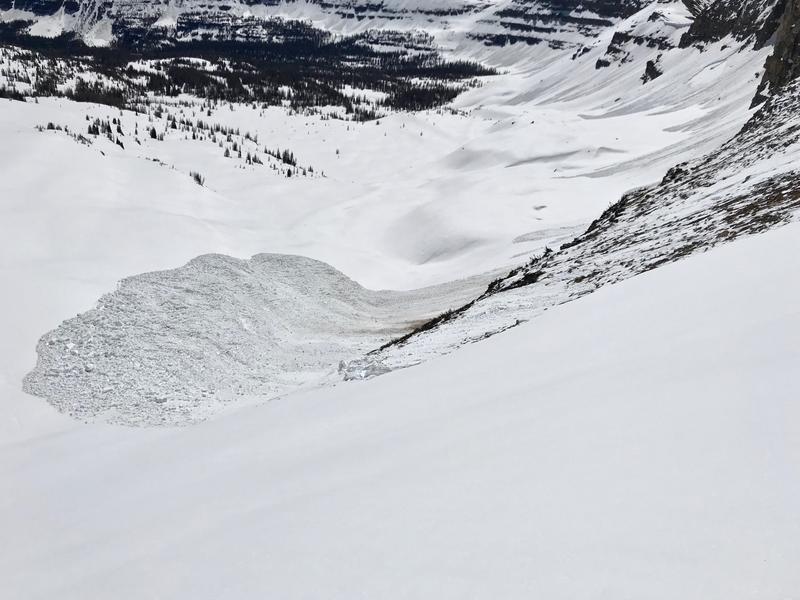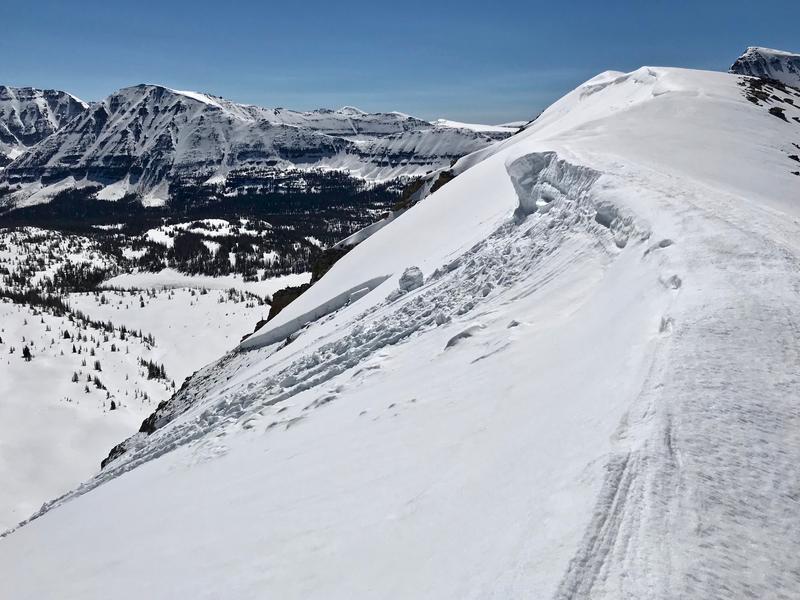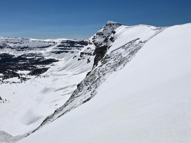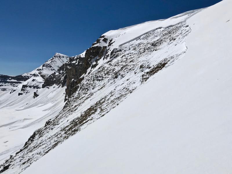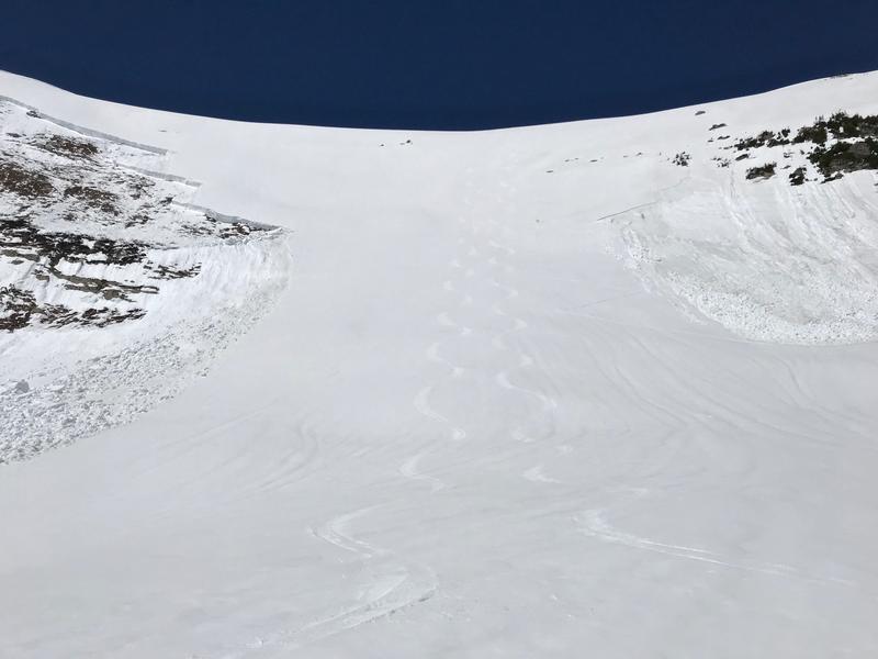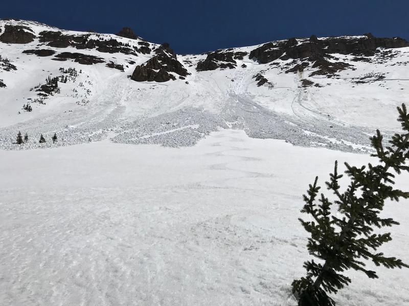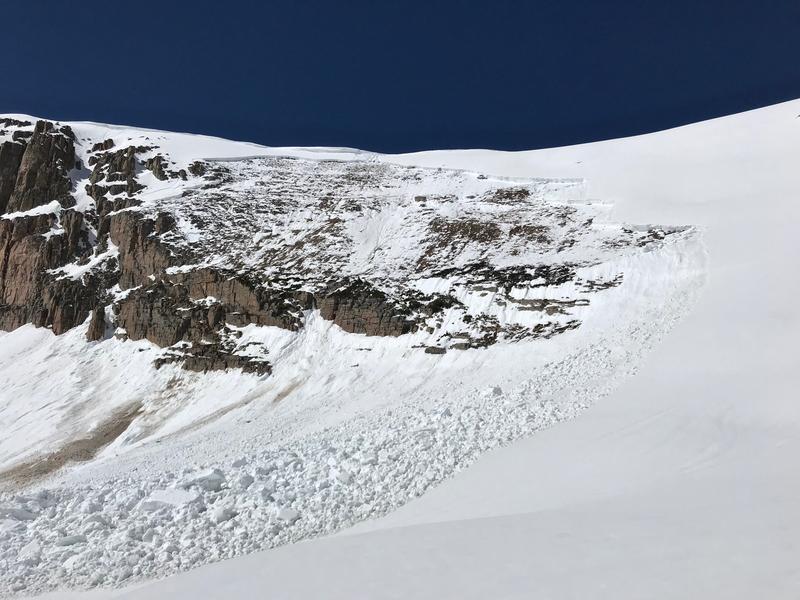 Had a great corn ski Sunday, 6/9 off the east facing side of Hayden ridge into Middle Basin. Of interest was a large natural slide observed. I was up here Wednesday, 6/5 and it had not slid. Warm temps Wednesday to Friday apparently woke up the snowpack. Best guess is it may have released sometime Friday, 6/7 as it looked relatively fresh. I wouldn't think it happened any later, as cold temps Friday night through Sunday probably locked things up. A good size cornice calved off initiating it. It stepped down to the ground, was over a football field wide and had a 2-3’ crown. Small car size blocks in the debris at the toe. Very impressive!