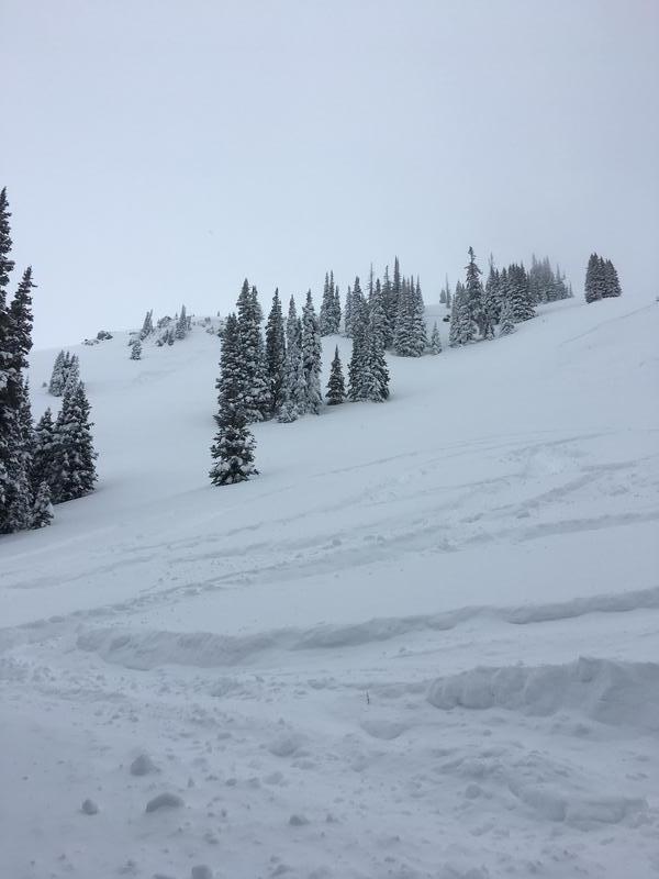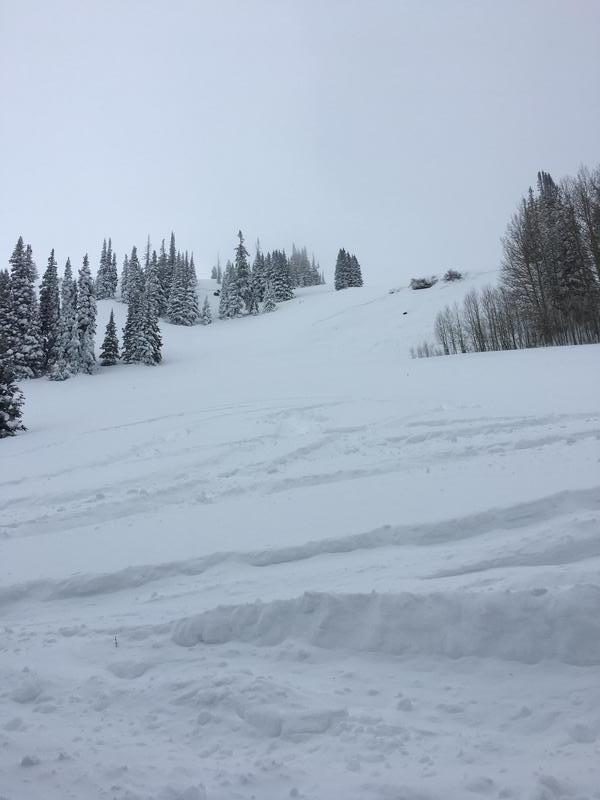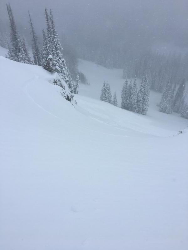 Intentional/remote trigger of storm slab from top of slope. Jumped and the fracture started 25 feet downslope. Propagated out to about 100 feet. Observed some other small natural releases in the same area. Good skiing on other aspects and slopes under 30 degrees... going to stay off the steeper north! Sorry about the image quality the light was very flat today