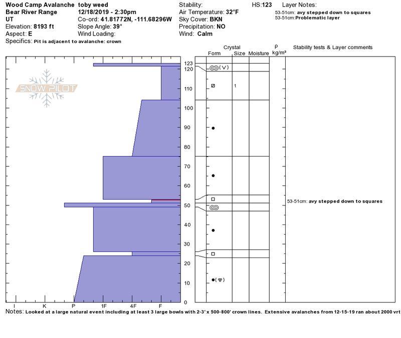 On my way way up Logan Canyon on 12-15-19, I could see a several large recent natural avalanches in the NE---S facing Wood Camp Bowls. The complex of significant natural activity featured avalanches 2' to 3' deep and hundreds of feet wide, running around 2000 vrt' in a common gully down to an elevation of 6500'. The avalanches failed on a thin persistent weak layer comprised of sugary faceted snow, above a melt-freeze crust and the stout layer from the moist Thanksgiving storm.