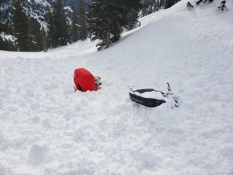 A group of friends sent me these pictures today riding on the south faces of sunset peak in American fork canyon triggered this slide at the top of the hill. South facing slope. Rider one was climbing and triggered the slide he was able to turn out of the slide path. second rider was near the bottom and got partially buried. No injuries. Odd to see this slide on the south face.