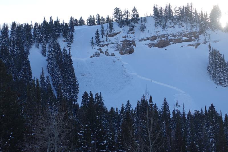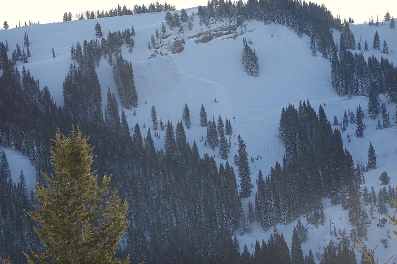 There were day old or more snowmobile tracks all over the apron below and the slide debris covered most of them. The skier had ridden many lines far to the lookers right of the bowl throughout the day.
