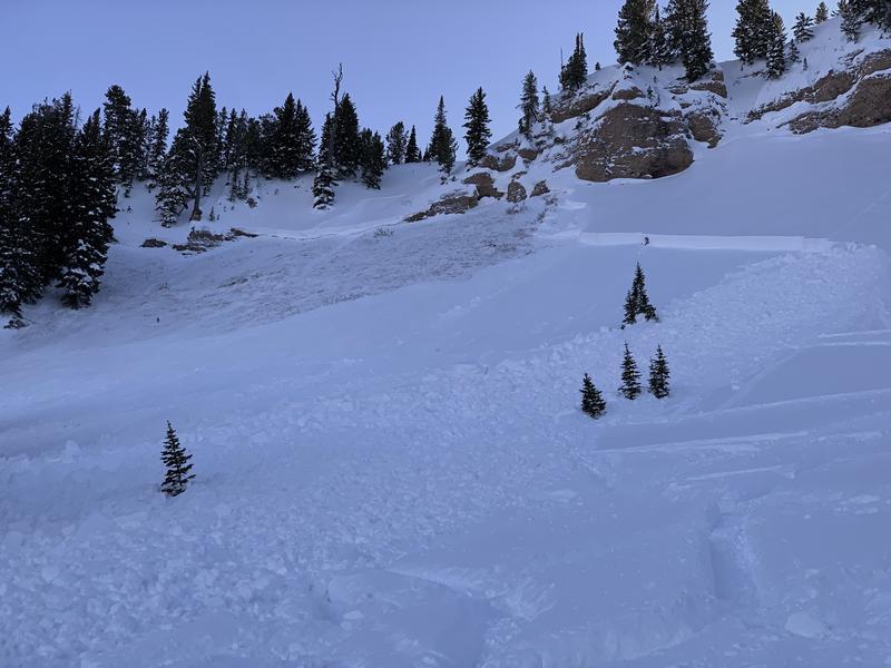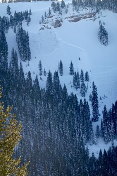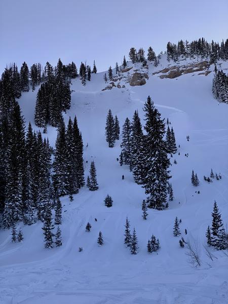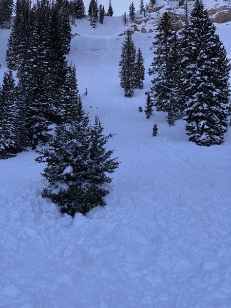 According to the skier he had passed the crown about 50' or so when it broke. Cracking loudly, sucking him in and taking him for a ride all the way to the bottom. He came to a stop atop the debris next to a good sized tree. Skis and poles lost. He was extremely lucky to have survived the ride and ended up on top.