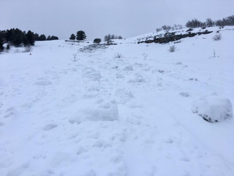 A moderate sized wet slough likely occurred Tuesday afternoon (as it wasn’t there Tuesday morning) on the Mendon Rock Slide south of Straight Hollow. The slide path began in the solar-effected cliff area at center-top of the rock slide and ran 700 vertical feet to the base of the rock slide. The path was littered with microwave-oven sized chunks of snow, but the deposition in the runout area was minimal, likely indicating a slow-mover.