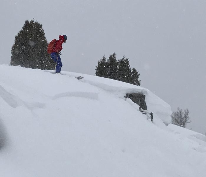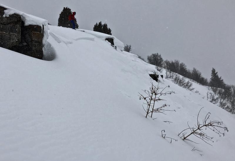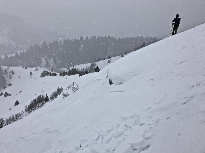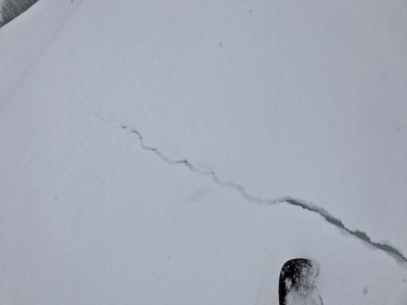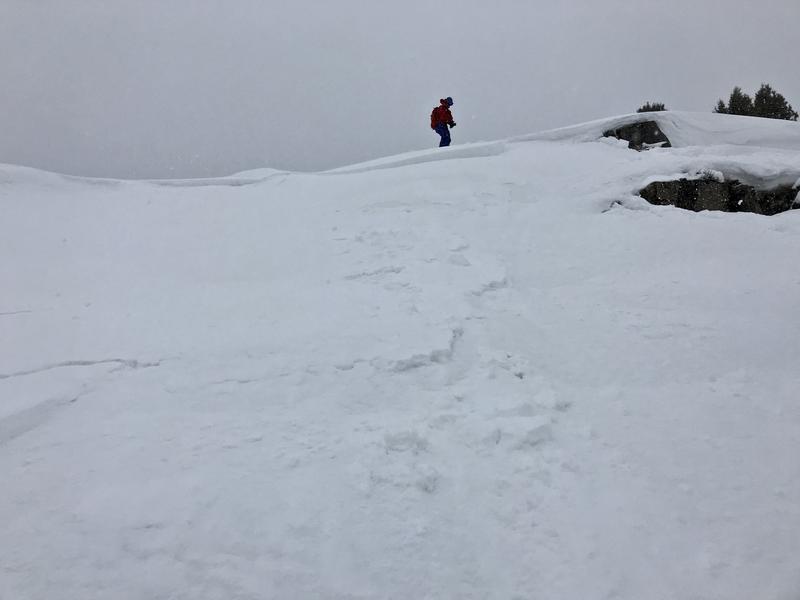 We intentionally triggered a storm slab avalanche consisting of heavy new snow. It was very sensitive, just requiring a small chunk of cornice. We also triggered some long shooting cracks in the drifted snow along the ridge.