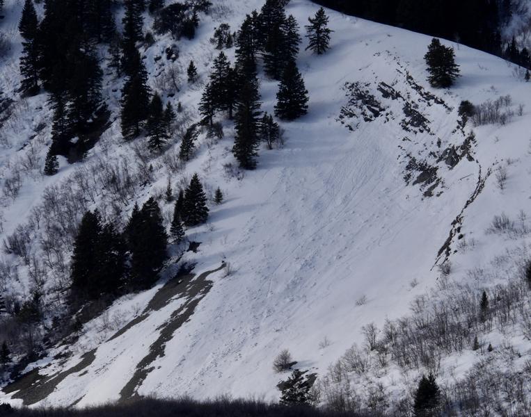 I could see evidence of several recent wet natural avalanches at lower elevations including this one in the Red Slide above Mendon.