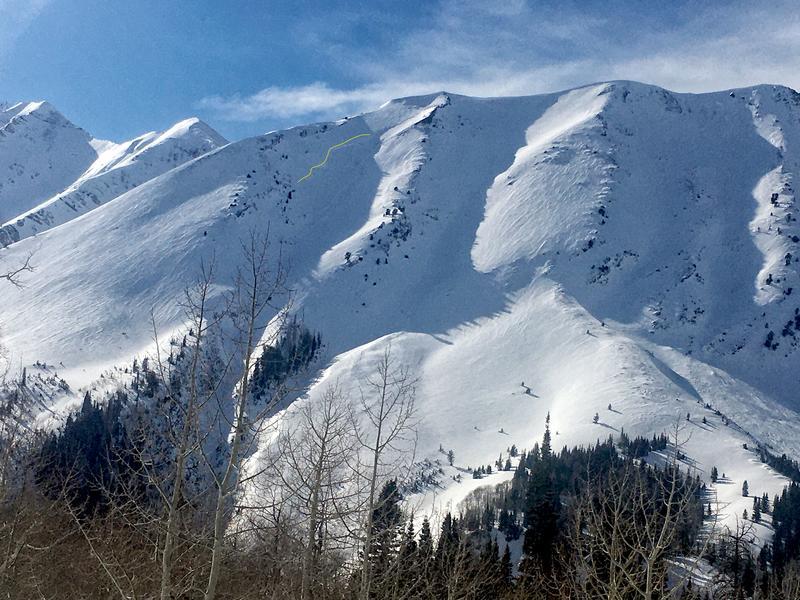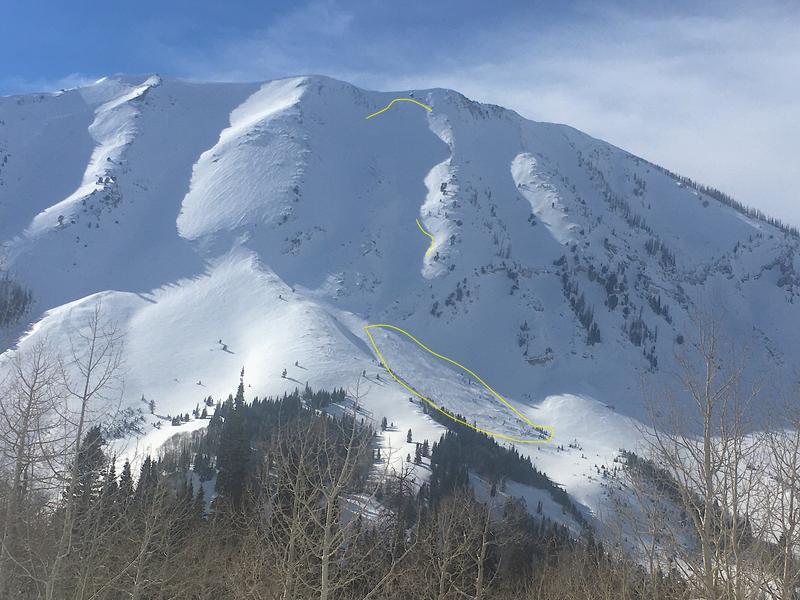 Spotted two natural avalanches on the North Peak of Mt Nebo. Strong south winds had raked the entire face. It was hard to tell depth of the crowns. 2-3 feet average maybe. Crowns and debris piles marked with yellow lines.