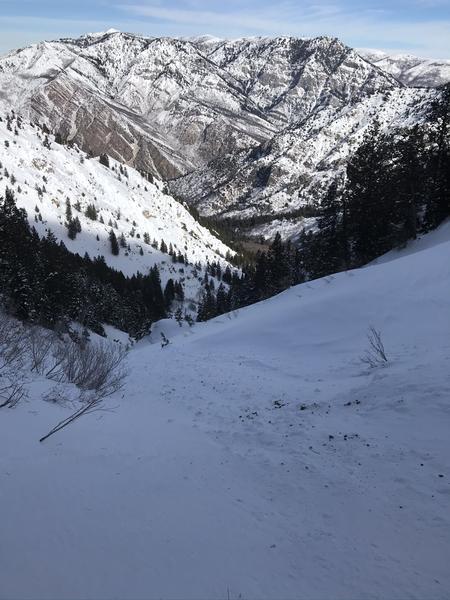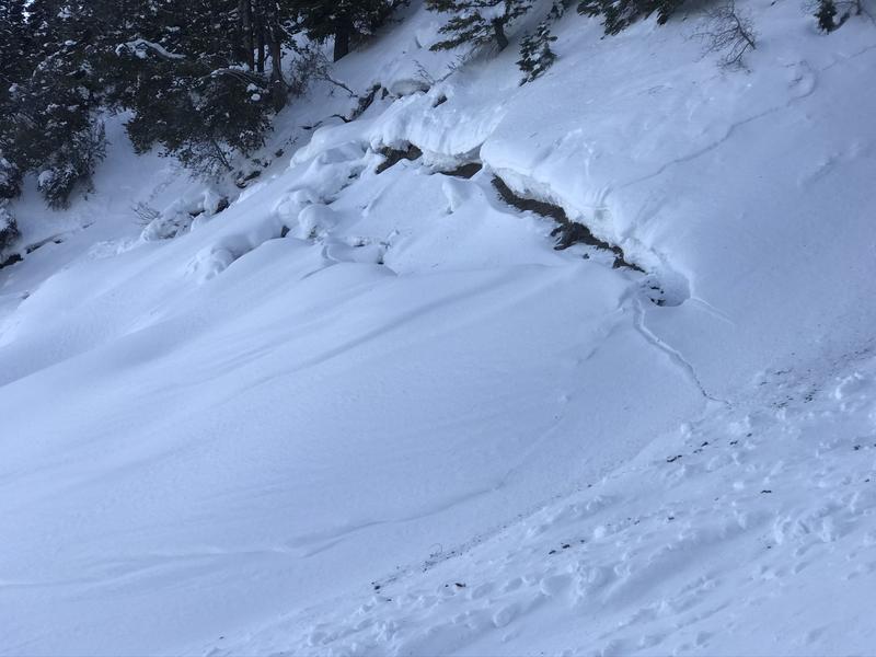 Observed the aftermath of a glide avalanche in Coldwater Canyon. Likely occurred last week. Appeared to only have sloughed 10'. Was out of town for two weeks, and ventured into the canyon to assess conditions. Naturals also occured down the main chutes in the canyon traveling what appeared to be 300+ feet. You wouldn't want to be caught in that terrain trap with conditions less than ideal. There was also aproximately 2-3" thick of hard crust on the top layer from wet snowfall/temps rising. Not exactly a great ride down, except in the trees up high, but worth going to see current conditions. Only saw a couple other ski tracks, looks like everyone was being cautious and avoiding the main open chutes, be safe & have fun out there