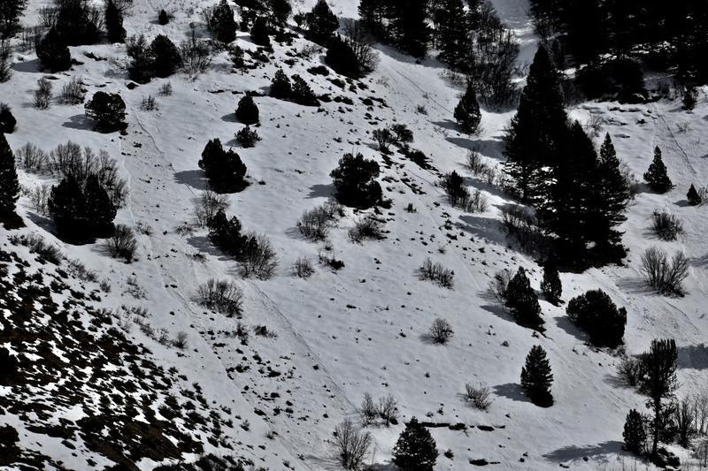 Reflections from wet snow or classy crusts shimmering on sunny slopes in the Wellsville Range.
