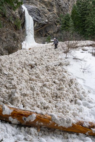 The weather has been stable for many days prior to today—clear, warm, and moderate wind, but little available snow to transport. The conditions today did cloud up on our walk in. My hypothesis is that the snow has been very stable in previous days despite the warmth and sun. Today the weather was slightly different, warm but cloudy. This could have warmed north facing snow more than previous days because it was not a clear sky. The cooler snow on these aspects may have naturally released because of warming from the cloudy sky today. Another possibility might be a glide avalanche since there are many slabs of rock above the route. From the ground it was impossible to see the starting zone and therefore any more information about the cause.
