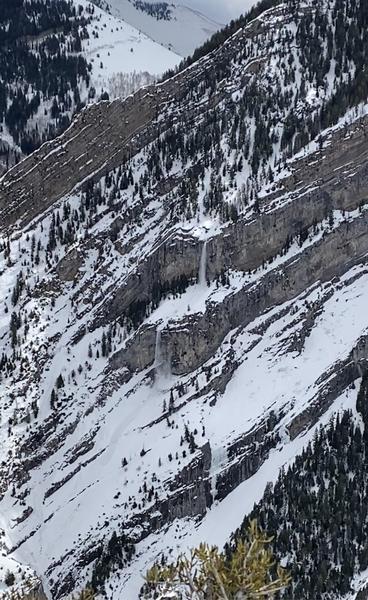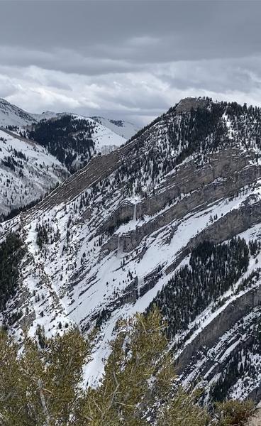 Observed from summit of Squaw Peak. We were volunteering at a race aid station atop the peak from about 11am - 2:30pm, and we observed at least 2 avalanches coming down the exact same spot across the canyon (north side of Y mountain). Heavy winds during this time period. Time of photos: 1:47pm.