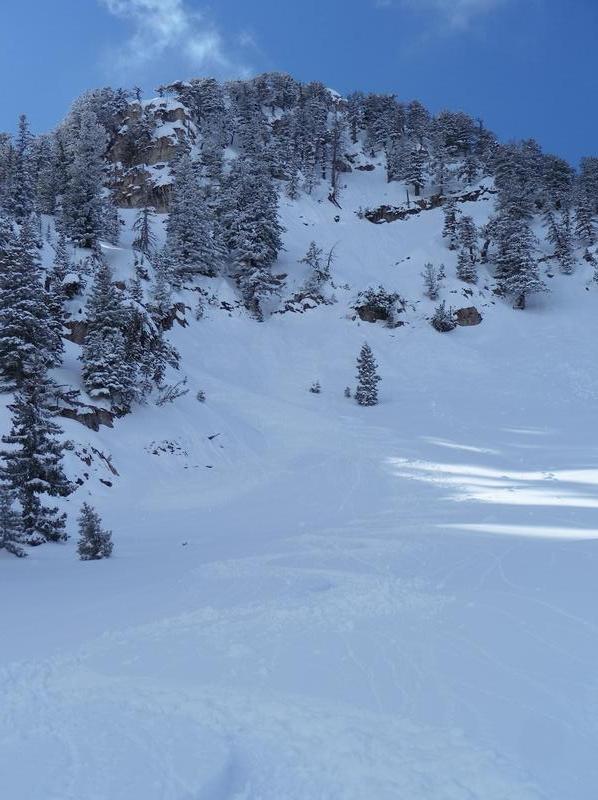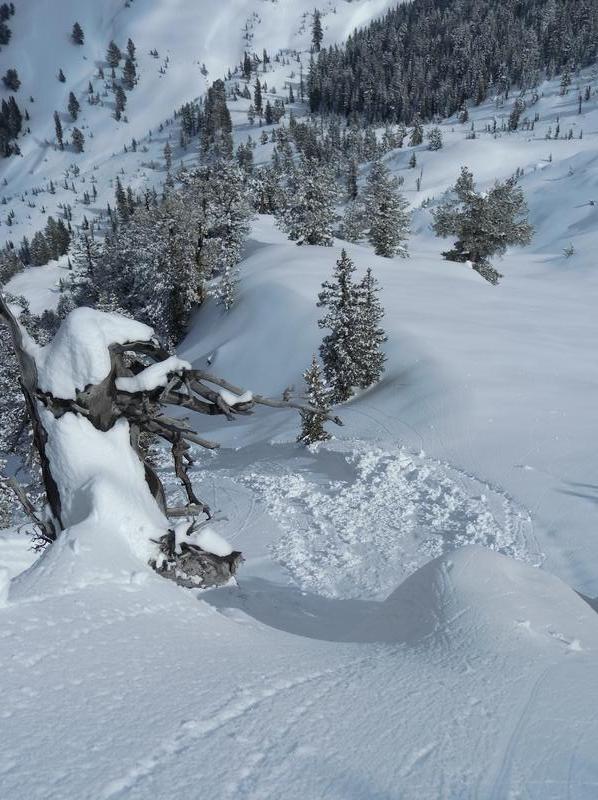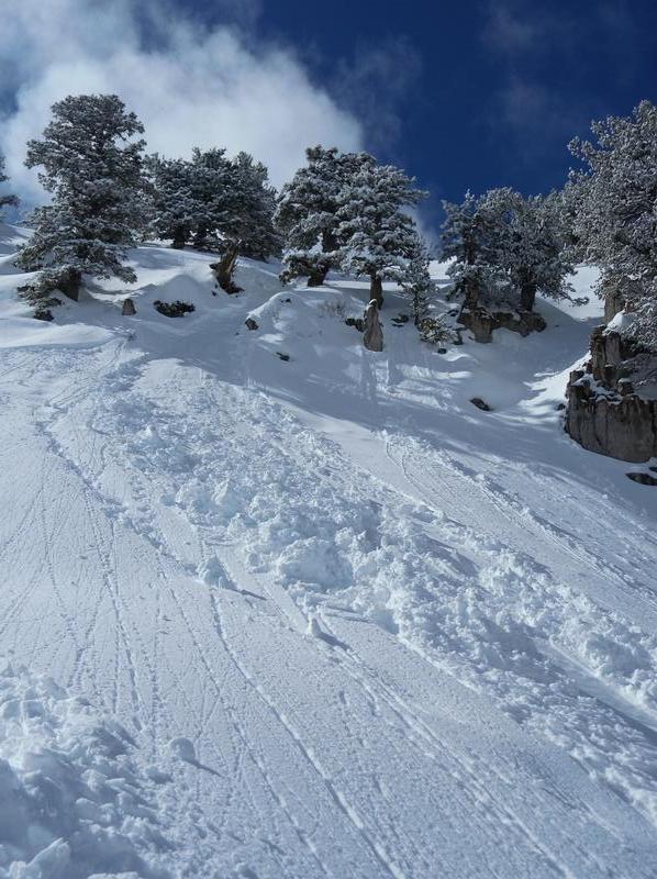 Ski cuts produced a point release avalanche that entrained the new snow and moved slowly like a wet slide. The new snow is bonded well until warming is enough to activate weaknesses in the snow. Snow was more stable in the cooler temps of the day. new snow also seems to be somewhat poorly bonded with light pow underneath and sluffs in steep terrain over about 35 degrees in steepness. The late day sun created sluffs on the west face of cherry peak. The trail has melted considerably and access is becoming tricky so watch out for streams and near surface encounters if trying the lower elevations.