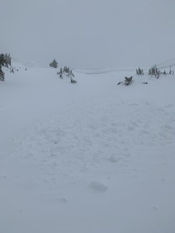 Likely caused by small cornice fall that may have been triggered by snowmobile traffic on the ridge. I saw riders pass by upper ridge near the avalanches spot earlier in the day and when I got up to that area the avalanche was pretty fresh.