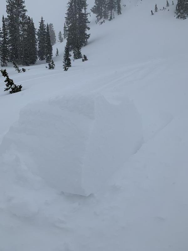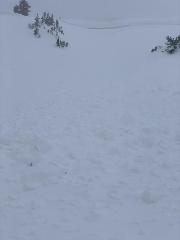 looked to be 12-16" deep running a couple hundred feet. Large pieces of cornice slid much farther down than the debris pile. Windloaded ridges were sensitive today and cornices breaking easily.
