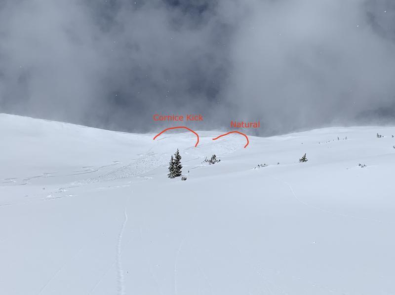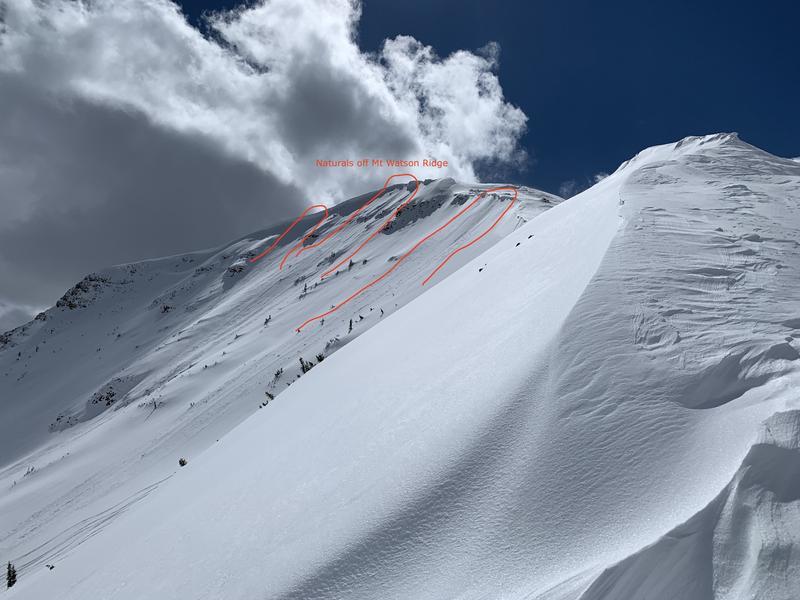 Several natural soft slab avalanches were observed on the Mt Watson ridgeline. Based on cornice tests performed lower down on the ridge, these appeared to have been cornice fall that triggered soft wind slabs.