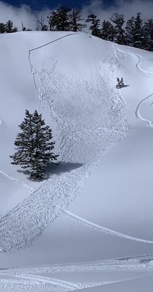 East face around 1030 am. Rider was powsurfing and riding a lightly corniced shoulder aside the main bowl. Rider was aware when it fractured, skirted the left side of the path and road away from the path.
