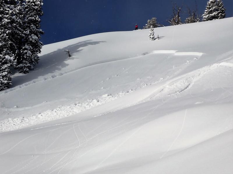 We rode in the Tony Grove area today. We found very sensitive conditions on east facing slopes. The snow has not bonded well to the underlying crust from last week. While riding Rocky bowl, we kicked of a medium sized slab about 70 feet wide and 15 inches deep (Picture 1 and 2). I was able to get out to a safe zone and watch as the avalanche ran to a bench about 400 feet below. We move to a slightly mellower angled slope to the south, which was also east facing, and had a crack propagate about 100 feet and opened up a 2 inch wide crack but did not slide. We kicked off a few smaller slab avalanches that only involved the top 4-6 inches of snow (lower avalanche on the 2nd picture, and also in the third picture). We also noticed several shallow slab avalanches on the East face of Mt Magog (Picture 4).