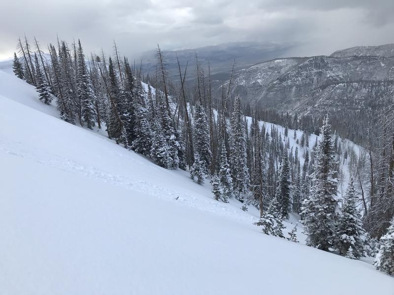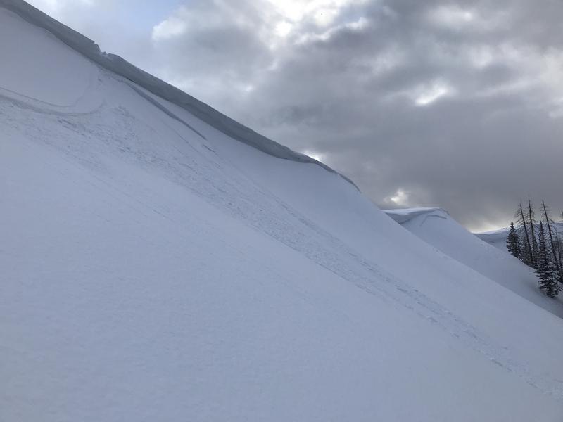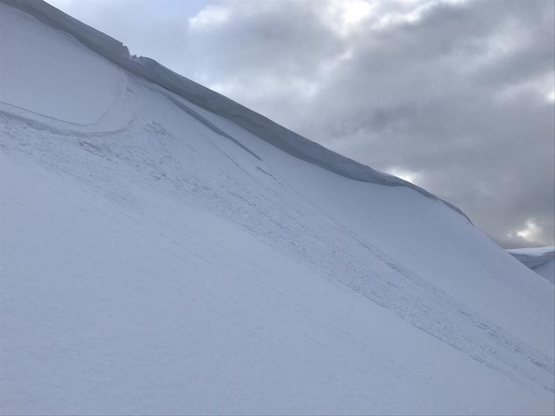 I triggered this small windslab on a ski cut. The crown seemed to be between 4 and 6 inches deep. I noted similar natural activity on adjacent slopes. The slide ran pretty fast and far, traveling the whole length of the chute. It did not step down to any deeper layers. Not deep enough to bury someone but definitely could have taken someone for a ride if they got caught. Today this problem was manageable but these windslabs developed in just a few hours of higher winds, so if winds continue to blow I would expect potentially deeper slabs tomorrow.