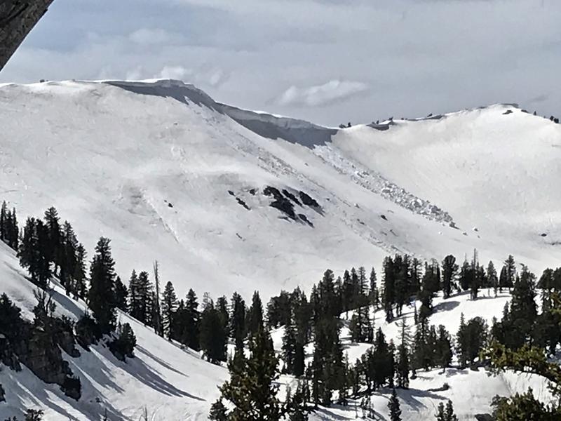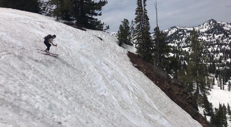 We found good coverage and mostly stable summer corn or firn snow in the Tony Grove Area. Exceptions are large overhanging cornices along the main Bear River Crest, and we noticed a fairly large recent natural cornice fall avalanche in Cornice Ridge Bowl. The dust on the snow surface has caused sun cups to develop in lower angled and sunny terrain, but we found areas with very nice smooth and silky conditions.