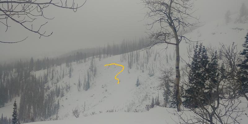 Observed the crown of this avalanche today. Visibility was decreasing when I spotted it so it was difficult to make out all of the characteristics and I never got close enough to make a more in depth inspection. My guess was that it was a day or two old. It appeared to have failed at the storm snow/old snow interface, D1. Apologies for the poor picture quality, I did my best to estimate the extent of the crown as observed (yellow line, attached).