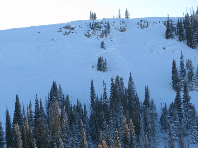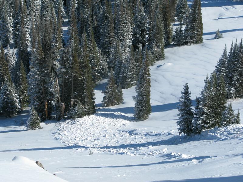 Looking downpath... once triggered, even a small pocket can get quickly out of hand if it slams you into the trees below.