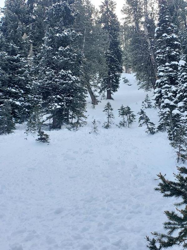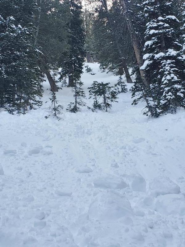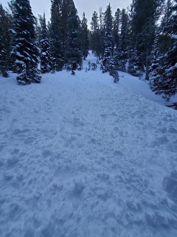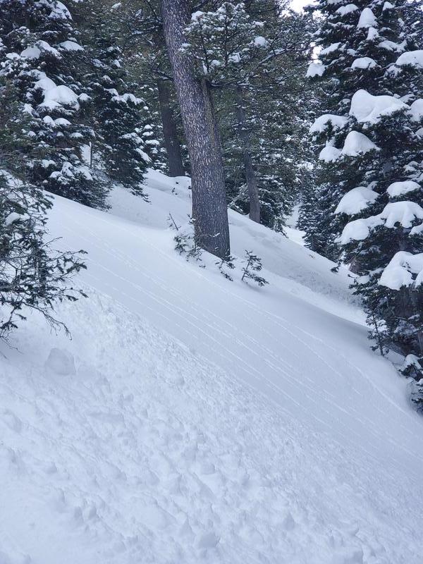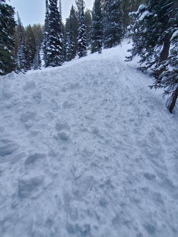I remotely triggered a decent slide in the trees in boss canyon on the furthest south wall,, i was sidehilling and came to a stop to watch the alley in front of me come down.. was a little nerve racking but I was in a pretty safe spot so I just watched it go down in front of me 30ft-40ft ahead. It broke about 150 yards up the hill and piled up in the bottom as seen on the probe marks.. aspect was n facing 36-38° elevation 8200ft.