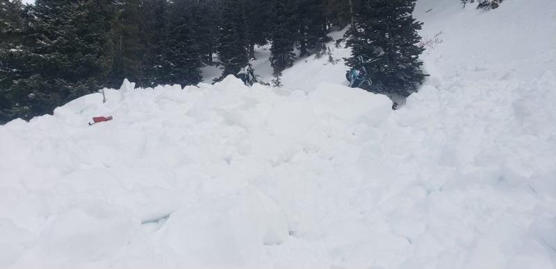 Jon was following Codie, saw the avalanche, and turned down the hill. He assumed Codie made it across safely. Jon reunited with Jonny and they quickly realized that Codie was not around. They rode up onto the deposition, saw his bike, and immediately realized he was under the snow. Jonny turned his beacon to receive/search and got a signal. He stayed in line with the bike and got his beacon numbers down to about 3. He probed, got a hit, and after digging a bit saw that it was a branch. He continued to probe until he got a solid strike and then he and Jon began digging feverishly. They reached Codie's head which was buried about 3' below the snow surface. Codie was unresponsive, blue, and foaming at the mouth. They believe it was about 15 minutes from the time of the avalanche until they reached his head. They continued to clear his body of snow while shaking him and trying to get him to respond. Codie described feeling completely dysfunctional - his arms and legs wouldn't work and he was hypothermic. It took about 30 minutes to get him free of the snow. Jonny described feeling utterly exhausted by the intense effort. Codie continued to slowly improve and despite having no sensation in his arms, hands and legs, he managed to ride out back to the trailhead. They got back to the trailhead around 3:30pm.