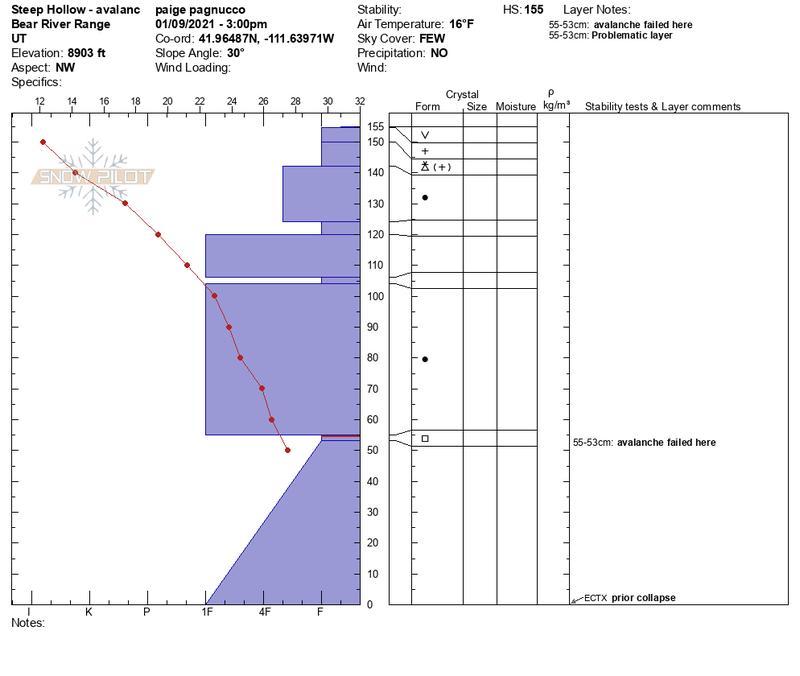 Weak layer was weak sugary facets from earlier in the season. This layer has been plaguing the Logan area backcountry since early December. We are just starting to see significant slab buildup on top of it. The slab ranged from 2-5' in thickness at the crown.