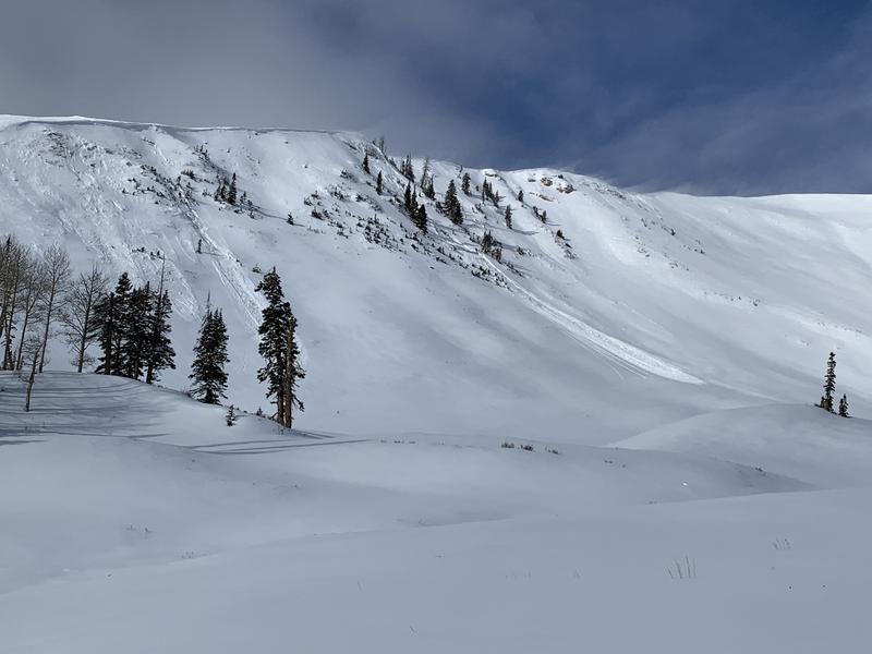 A couple of small wind slabs from today's winds, likely triggered by cornice. One of the wind slabs (farthest lookers right in the photo) then triggered a small persistent slab lower on slope. Would expect increased likelihood of both wind slabs and persistent slabs the next couple days on northerly facing slopes as winds continue.