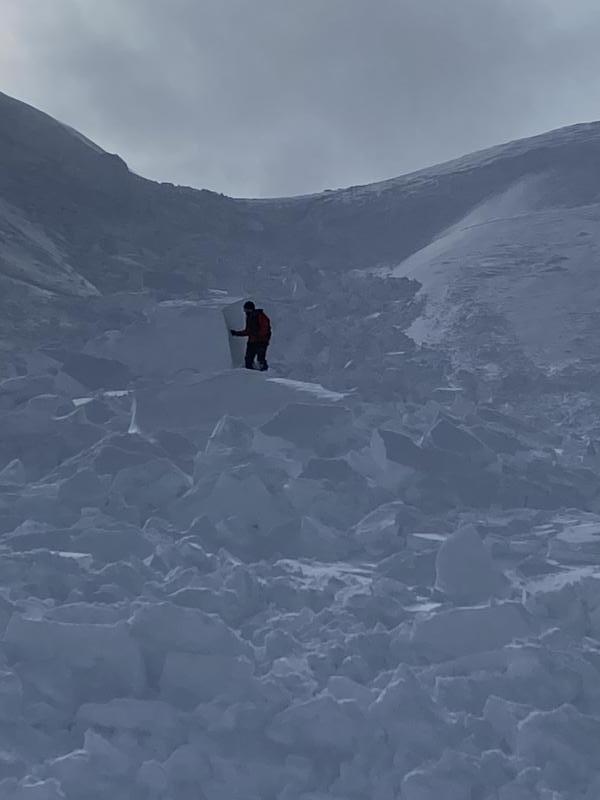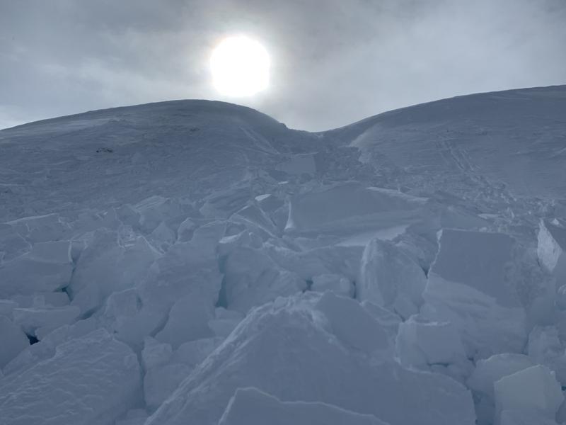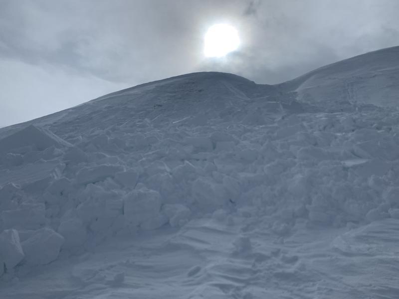 Large debris from wind loaded ridge above. Some pieces larger than 6' tall. Did not reach full runout potential. Connect slopes looked suspect that identical loading and aspect. Angle starts at about 38° and ran out on the mostly 35° slope.