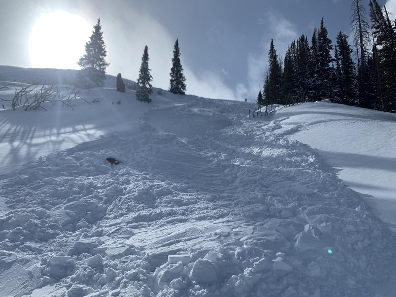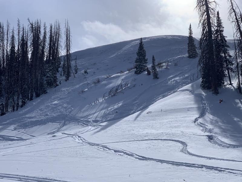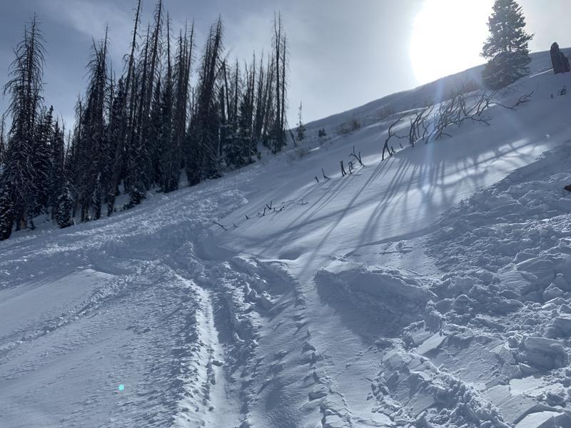 I'm guessing this avalanche was triggered by the same group of snowmobilers that triggered another slide nearby. Same aspect and only slightly lower elevation. This slide propogated quite a ways along the ridge into the trees with a few shallow terrain traps. There was also a log that appeared like it went along for the ride. Not as large of debris as the neigbhoring slide, but the propogation and landscape hazards are concerning. This slope is also average of 30°, which is also another red flag. Starts closer to 38°. If I had to guess, I would think this was triggered from lower on the slope, but hard to tell from the tracks.