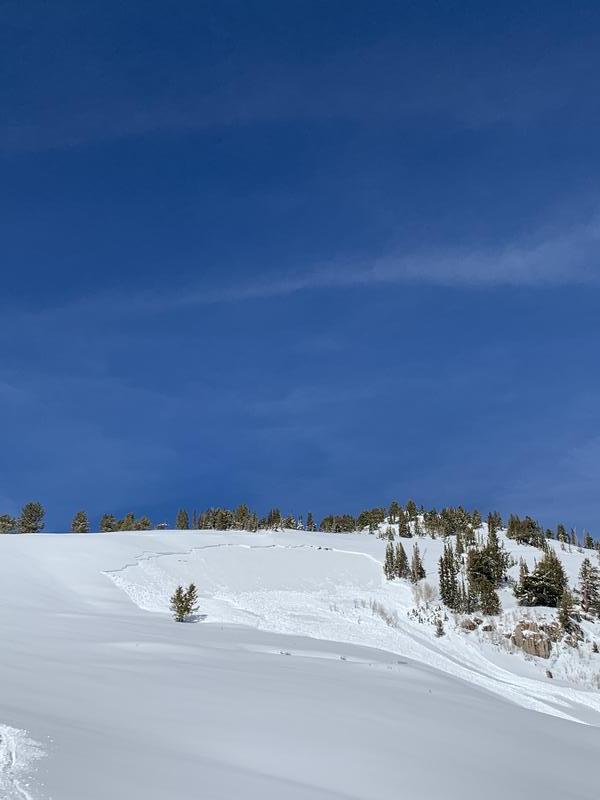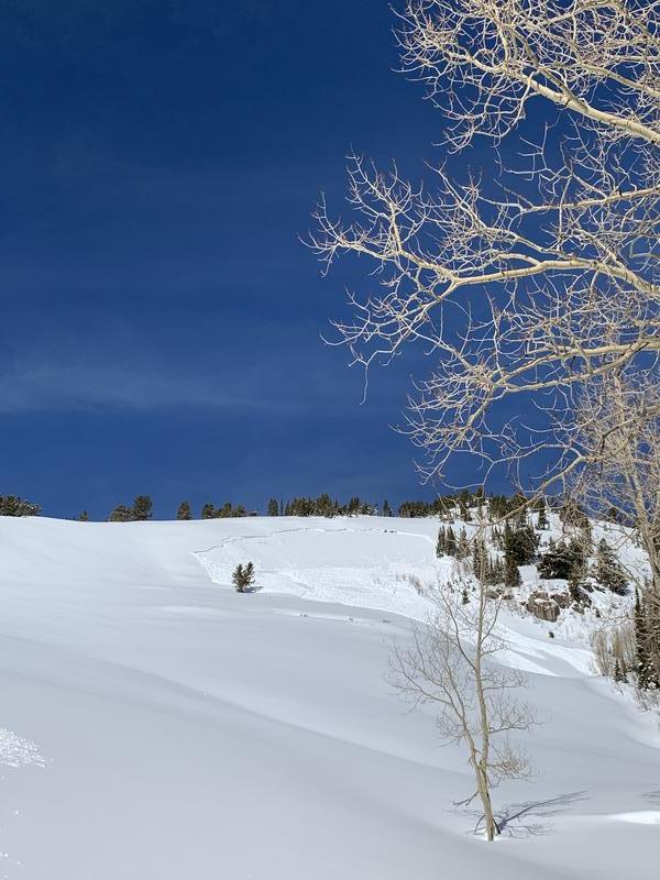 Ascended to the bottom of Miller Time where we found this slide, apparently triggered by a party of four heli skiers as they traversed the low angle ridge above the bowl. The trigger point appears to be the shallowest part of the convexity on the lookers right of the crown where we observed tracks within about 20' of where the slide broke. We had not planned on skiing the bowl ourselves but found it notable to see such a well connected slide on a south aspect. It appeared to have failed at our friendly neighborhood PWL, with a little help from some wind loading evident in the stepped crown on the left. The area that slid is low 30s in steepness and as a result the slide didn't travel particularly far or collect deeply; simply more signs of the very touchy situation out there right now.